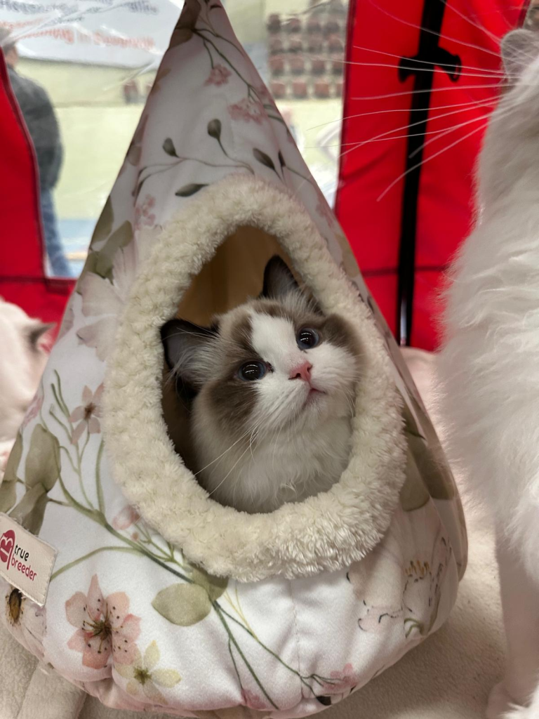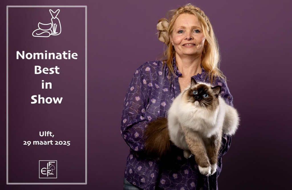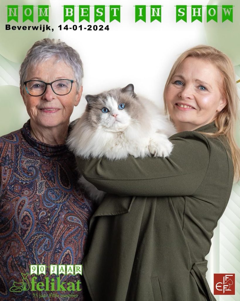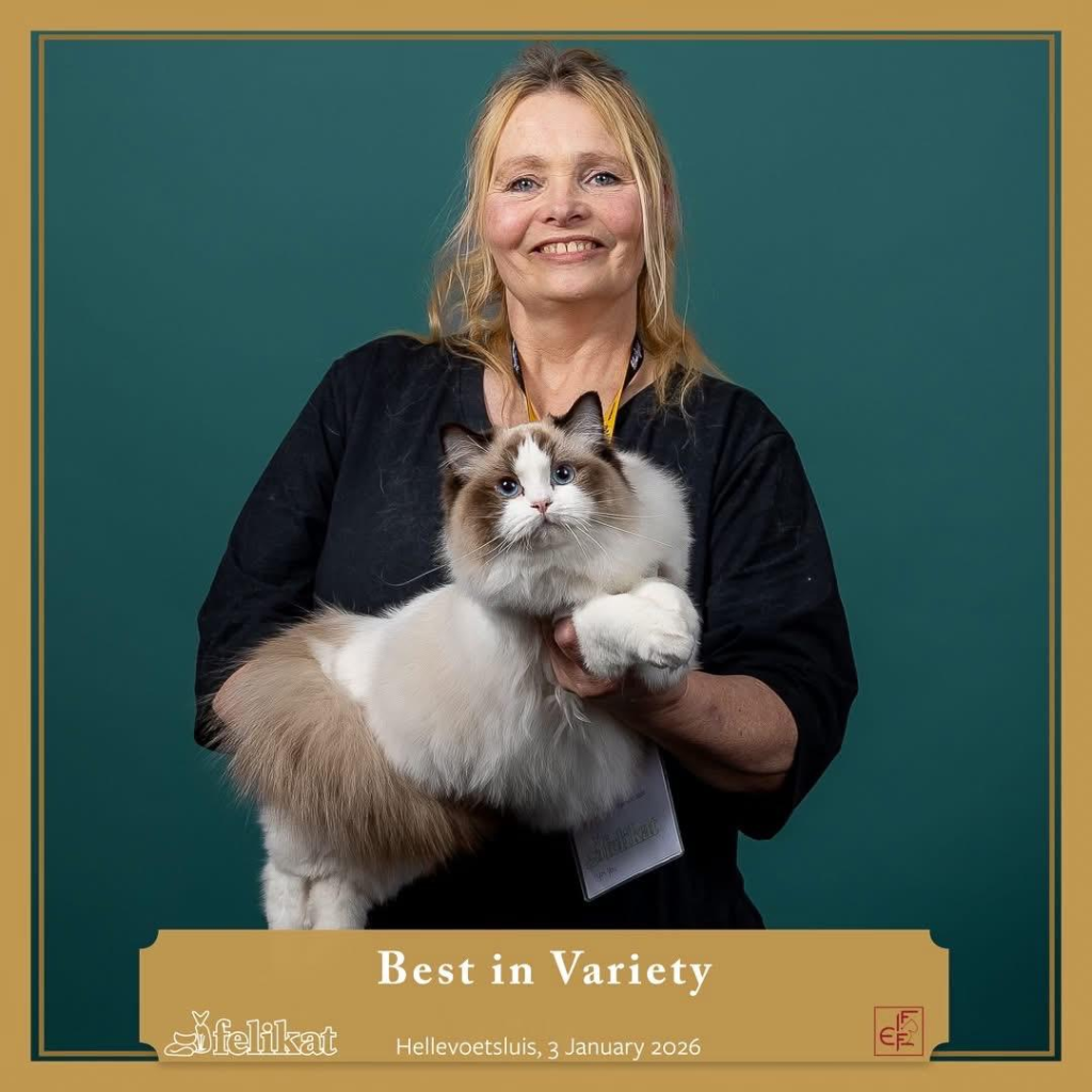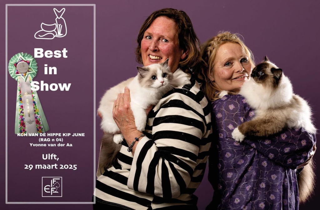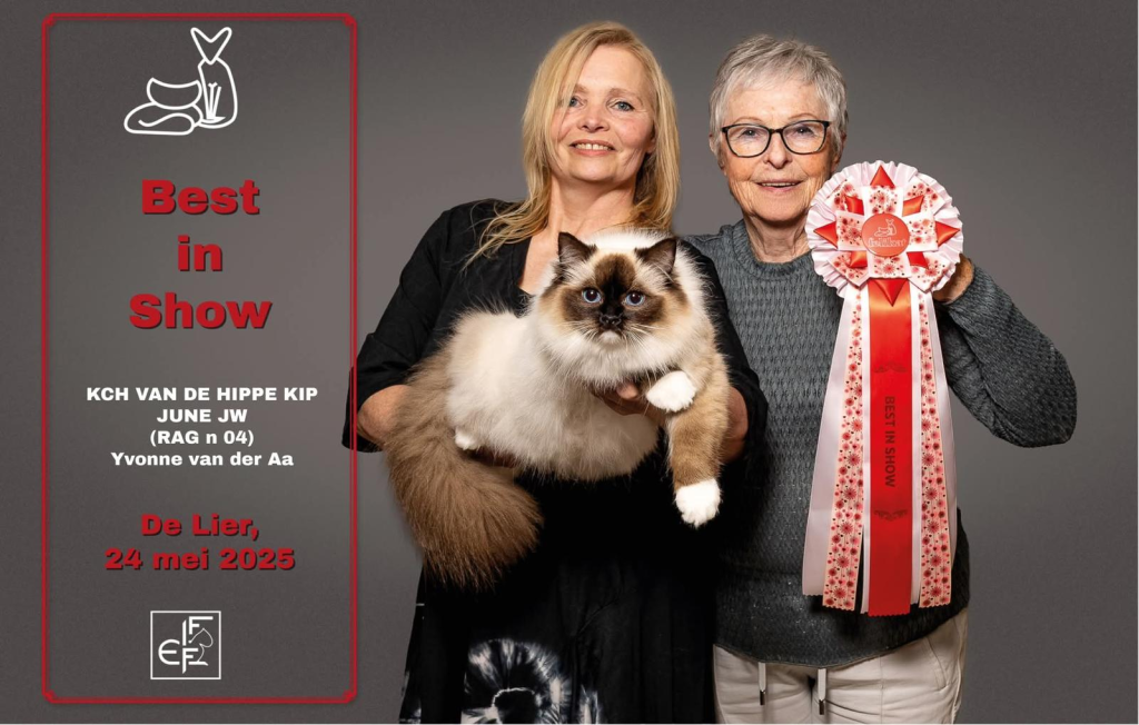 Bij ons is op 11-8-2024 June geboren een seal mitted poesje. Vader: Jaquet Marzog Mecoté kater afkomstig uit Noorwegen en Groot internationaal kampioen in de kleur Seal mitted. Moeder: Griet van de Hippe Kip Blue Bicolor ook bij ons in de Cattery geboren ze is International Champion. June gaat Griet vervangen, Griet gaat met pensioen. June heeft een super karakter net als haar ouders ze is relaxed en wil heel graag met je kroelen en spelen dat vind ze ook heel leuk ze heeft de super zijde zachte vacht zoals dat gewenst is bij de ragdoll. Ook June is al op show geweest en heeft mooie jury raporten ze is al Kitten Champion. Op de leeftijd van 1 jaar wordt ze onderzocht op HCM,PKD,Cin,five en Felv de DNA test is opgestuurd we wachten op de uitslag. June is een ster op show in de kittenklasse van 3 shows al 6x Best in show Ze mag zich dus nu de mooie Titel Junior Winner achter haar naam schrijven. Beste kitten van 2025 mag nu ook NW’25 voor haar naam schrijven.